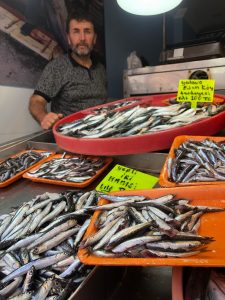 Tezgahtaki balıkların Marmara Bölgesi’nden geldiğini söyleyen Bilim, “Eylül ayının gelmesiyle balıkçılık sezonu açılır. Bu mevsimde daha çok palamut lezzetlenir. Çünkü yağmur suyunu alan palamut irileşiyor ve bollaşıyor. Lüfer, izmarit, barbun, çinekop, çipura, kılıç ve kırlangıç Eylül ayında da çok bol avlanır. Şu anda istavritin kilosu 80 TL, sardalyanın kilosu 100 TL, yerli uskumru 80 TL olmak üzere farklı çeşit balıkları müşterilerimizin sofralarına sunuyoruz” şeklinde konuştu.