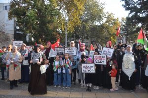 - İsrail’in Gazze’de yapmış olduğu saldırılara tepki göstermek için bir araya gelen İHH gönüllüsü kadınlar, Cevdet Aydın Parkı önünde bir saatlik oturma eylemi yaptılar.
