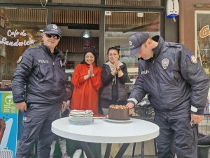 İsmet Acar Caddesi üzerinde hizmet veren Cafe De Sandwich işletmesinin sahipleri Feyza Geçer ve Burcu Adıyaman, Türk Polis Teşkilatı’nın 180. kuruluş yıl dönümünü unutulmaz bir jestle kutladı. Polis ekiplerini “işletmede kavga çıktı” ihbarıyla adrese çağıran Geçer ve Adıyaman, olay yerine gelen polisleri ellerinde pasta ile karşıladı. Polis ekipleri, hazırlanan özel pastayı çevredeki esnafla birlikte keserek bu anlamlı günü kutladı.