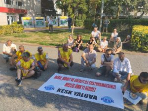 Basın metnini Eğitim-Sen Üyesi Özlem Türk okudu. Basın açıklamasında şu sözlere yer verildi: “Mecliste görüşülen ÖMK yasasını protesto etmek amacıyla, en doğal demokratik Anayasal haklarını kullanmak için Meclise yürümek isteyen Eğitim-Sen üyesi arkadaşlarımız engellenmiş, şiddet kullanılarak dağıtılmıştır. 11 arkadaşımız gözaltına alınmıştır. Bu durumu protesto etmek amacıyla Eğitim-Sen Yalova Şubesi, Yalova Emek ve Demokrasi güçlerinin de desteğiyle bir basın açıklaması ve oturma eylemi gerçekleştirmiştir. Dün Ankara’nın göbeğinde, TBMM’in yakınında öğretmenlere, sendika ve konfederasyonumuzun yöneticilerine çetelere, mafyalara, rantçılara, depremde on binlerin ölümüne neden olan müteahhitlere kurulmayan barikatlar kuruldu, yasaklamalar getirildi. Defalarca TBMM Meclis parkına kadar yürüyüp parkta açıklama yaparak oturma eylemi yapacağımızı, eylemimizin tamamen barışçıl ve demokratik olduğunu ifade etmemize rağmen güvenlik güçleri iktidarın talimatıyla binlerce güvenlik gücünü karşımıza dikerek yasaklamada ısrar etmişlerdir. Anayasal hakkını kullanmak, ülkemizi karanlığa sürükleyecek Öğretmenlik Meslek Kanunu yasa tasarısına karşı tepkisini ifade etmek isteyen Eğitim-Sen ve bağlı sendikalarımız yönetici ve üyeleri, konfederasyonumuz Yürütme Kurulu üyeleri Ankara’nın mafyanın çiftliği haline gelmesine seyirci kalan güvenlik güçlerinin gazlı, coplu, tekme tokatlı saldırısına uğradı. Başka bir sendikanın yürüyüşüne olması gerektiği gibi izin veren güvenlik güçleri sendikamız Eğitim-Sen’in yürümesini ve basın açıklamasını ise çoğunluğu sendika MYK üyelerimiz, yöneticilerimiz olmak üzere 11 arkadaşımızı darp edip gözaltına alarak engellemiştir. Açıkça sendikal ayrımcılık yapıldı. Konfederasyonumuz yürütme kurulu üyeleri, sendikalarımız yönetici ve üyeleri yerlerde sürüklenmiş, hedef alınarak gözlerine gaz sıkılmıştır. Bu durum başta anayasanın 10 maddesi olmak üzere temel hak ve özgürlüklerin polis zoru ve şiddetiyle ortadan kaldırılmasıdır. Ülkemizi sendikal hakların kullanımında dünyada en kötü 10 ülke listesine sokanlar bu yasaklama ve saldırıyla eleştirilerin ne kadar haklı olduğunu bir kez daha ispatlamışlardır. 9 Temmuz’da Ankara Kızılay’da iktidarın eğitim ve bilim emekçilerine, sendikamız Eğitim-Sen yönetici ve üyelerine yapılan saldırıyı ve demokratik haklarımızı kullanmamızı engellenmesini şiddetle kınıyoruz. Saldırıyı gerçekleştiren, haklarımızı kullanmamızı engelleyenler ve sendikal ayrımcılık suçunu işleyenler hakkında suç duyurusunda bulunacağımızı ifade etmek istiyoruz. Bu saldırılar, yasaklamalar, işkence ederek gözaltına almalar fiili ve meşru mücadelemizden bir adım olsun geri adım attırmayacaktır. Toplumsal ilişkileri ve geleceğimizi kendi ideolojik referanslarına göre şekillendirmeyi hedefleyen Öğretmenlik Meslek Kanununu sessiz sedasız Meclis’ten geçirmek istiyorlar. Haklarımıza ve geleceğimize sahip çıkacağız. Sendikamız Eğitim-Sen Öğretmenlik Meslek Kanunu (ÖMK) gündeme getirildiği günden bu yana teklifinin tehlikelerine ve iktidarın teklifle neleri hedeflediğine dikkat çekmektedir. İktidara ve Milli eğitim Bakanlığına uyarılarda bulunmaktadır. Ancak AKP+MHP iktidar bloğu uyarıları ve eleştirileri dikkate almadığı gibi cemaatlerin, tarikatların isteklerine göre hareket etmektedir. Yasa teklifinin hazırlanma sürecinde yandaş sendikalar dışında kimsenin düşünce ve önerileri alınmamış, eleştirilere kulaklar tıkanmış, Bakanlık bildiğini okumuştur. Peki, Eğitim-Sen ve bizler bu kanun teklifine neden karşı çıkmaktayız? Kanun teklifi öğretmenlik mesleğini değersizleştirmekte, öğretmenlerin iş güvencesini ciddi anlamda tehdit etmekte, eğitim fakültelerinden mezun olmayı ayrıntıya indirgeyip kurulacak Eğitim Akademileri üzerinden AKP kadrolarını yetiştirmeyi hedeflemektedir. Öğretmenlerin ekonomik sorunlarına çözüm üretmemekte, eşit işe eşit ücret ilkesini ortadan kaldırmaktadır. Eğitim emekçilerinin özlük haklarını zayıflatmakta, ayrımcılığı ve eşitsizliği derinleştirmektedir. Eğitim emekçilerinin kazanılmış haklarını önemli oranda ortadan kaldırmakta, eğitim fakültelerinden mezun olmayı öğretmenliğe atanmada bir ayrıntı haline getirmektedir. Özel okul ve kurslarda öğretmenlik yapanların başta taban ücret düzenlemesi olmak üzere temel ekonomik ve sosyal haklarına, ücret ve çalışma koşullarına ilişkin bir düzenleme içermemektedir. Kanun taslağında öğretmenlerin sorumlulukları detaylı bir şekilde belirtilirken, hakları konusunda daha genel ifadelerin kullanılmış olması dikkat çekmektedir. Öğretmen adaylarına ve öğretmenlere yönelik disiplin cezalarının ve bu cezaları gerektiren fiil ve davranışların detaylı olarak düzenlenmesi bir gözdağı, öğretmen ve öğretmen adaylarının iş güvencesine yönelik açık bir tehdittir. Kanun taslağı birçok noktada keyfiliğe yol açabilecek açık noktalar barındırmaktadır. Bunlardan biri de kanun taslağının 34. Maddesidir. Maddeye göre, mesleki yetersizliği iki müfettiş raporuyla görülen öğretmenlerin akademiye alınması ve akademi eğitimi sonrasında da müfettişlerce başarısız görülmeleri halinde genel idari hizmetler sınıfında uygun yerlere memur olarak atanmaları düzenlenmektedir. Bu madde, öğretmenlerin iş güvencesini iktidarın keyfiliğine bırakacak diğer önemli bir tehdittir ve kabul edilemezdir. Buradan iktidara sesleniyoruz: ÖMK’yı derhal geri çekin. Gerçek bir meslek kanunu hazırlamak istiyorsanız, ILO ve UNESCO ortak belgesi olan; “Öğretmenlerin Statüsü Tavsiyesi” metnini esas alın. 5 Ekim 1966 yılın
