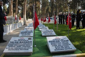 Meydandaki programın akabinde Yalova Şehitliği ve Polis Şehitliği’ne geçildi. Saygı duruşu ve saygı atışının ardından Yalova Valisi Dr. Hülya Kaya tarafından şehitlik defteri imzalandı. Protokol üyeleri tarafından aziz şehitlerimizin kabirlerine karanfil bırakıldı ve ardından İl Müftüsü İlyas Yılmaztürk tarafından dua edildi.
