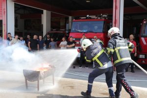 - Çiftlikköy Belediyesi çalışanları, İş Sağlığı ve Güvenliği eğitimleri kapsamında önce temel yangın eğitim aldı, ardından itfaiye önünde yangın söndürme çalışması yaparak öğrendiklerini uyguladı.