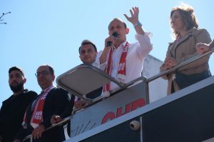 teşekkür ediyorum” diye konuştu. Adil Yele, gençlerin “Ceketi çıkar, kolları sıva” sloganları üzerine ceketini çıkarıp konuşmasını yaptı. Belediye Başkan Adayı Adil Yele, daha sonra Milletvekili Tahsin Becan, İl Başkanı Erdem Doğancı, İlçe Başkanı Savaş Kaşıkçı, İl Gençlik Kolları Başkanı Cem Karadağ ile birlikte kendisini destekleyen kalabalığı selamladı.